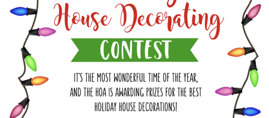We will be having our second annual holiday decorating contest this year! There are just a few days left before judging on the 21st. For those wishing to participate, please make sure your lights are on between the hours of 6:00PM and 7:30PM. We will be coming around to take a few pictures for the board to select the winner (board members are not eligible since they are selecting the winner). Good luck to all and we are looking forward to seeing our neighborhood all decked out!