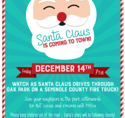 It’s that time of the year again – Santa will make his return to Oak Park this Saturday (12/14) at approximately 7PM and is planned to start his run at our north entrance. From there he will head down Gallagher Loop to Haynes, turning left on Haynes to make the loop and then exit at Haynes and Dodd. Keep in mind they are unable to turn the firetruck around on Belle Meade, so residents down there should come out to Belle Meade and Gallagher or meet in the park for viewing.
