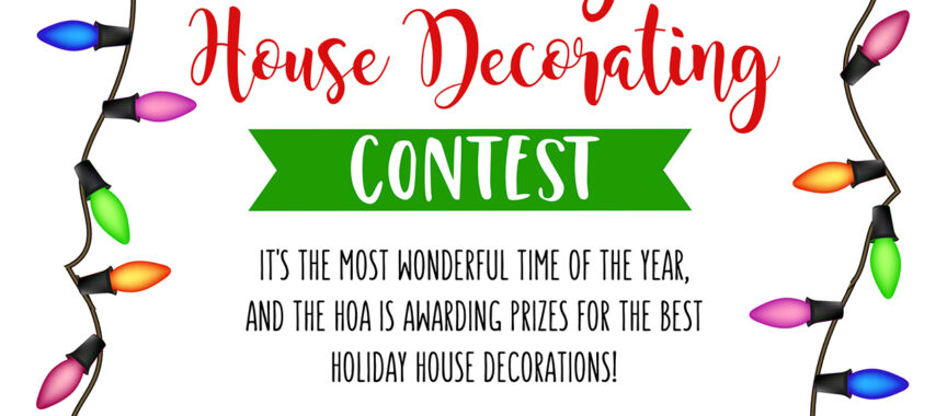 We will be having our sixth annual holiday decorating contest this year! There are just a few days left before judging on December 16th. For those wishing to participate, please make sure your lights are on between the hours of 6:00PM and 7:30PM. We will be coming around to take a few pictures for the board to select the winner (board members are not eligible since they are selecting the winner). Good luck to all and we are looking forward to seeing our neighborhood all decked out!